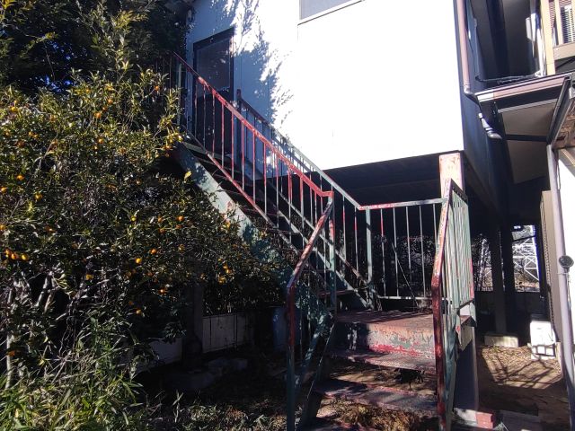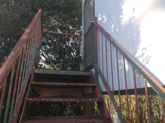 倉庫の中を拝見。階段は錆が目立ちます。